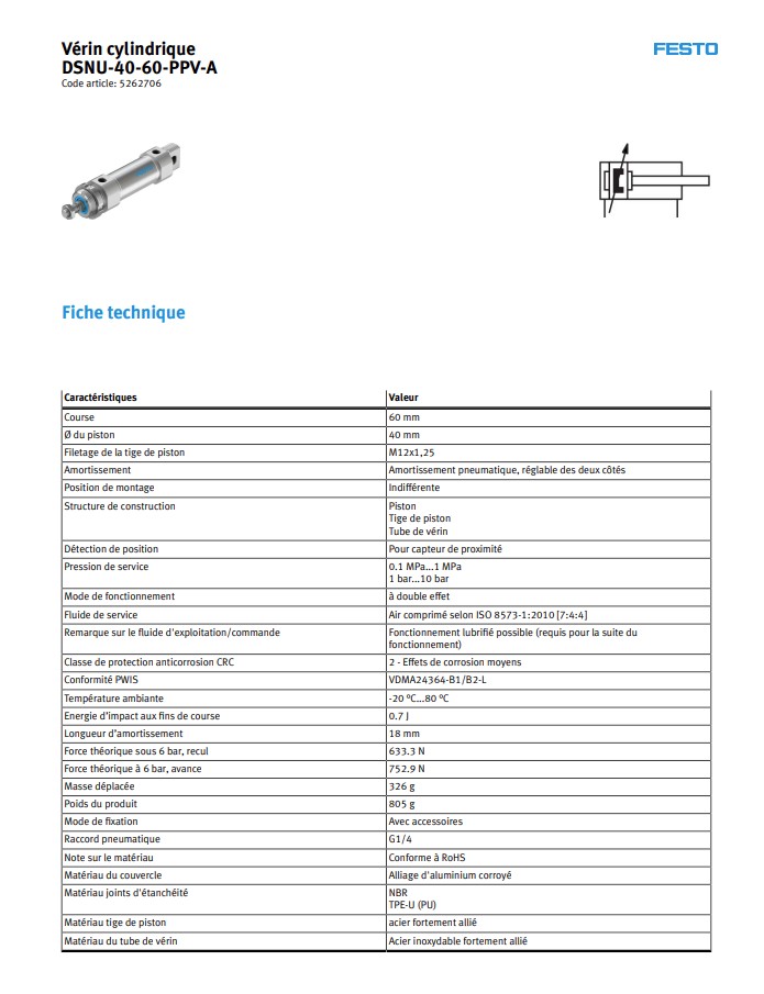 Robuste et performant, le DNU-40-60-PPV-A est idéal pour les lignes de production automatisées, les systèmes de manutention ou tout équipement pneumatique nécessitant précision et répétabilité.