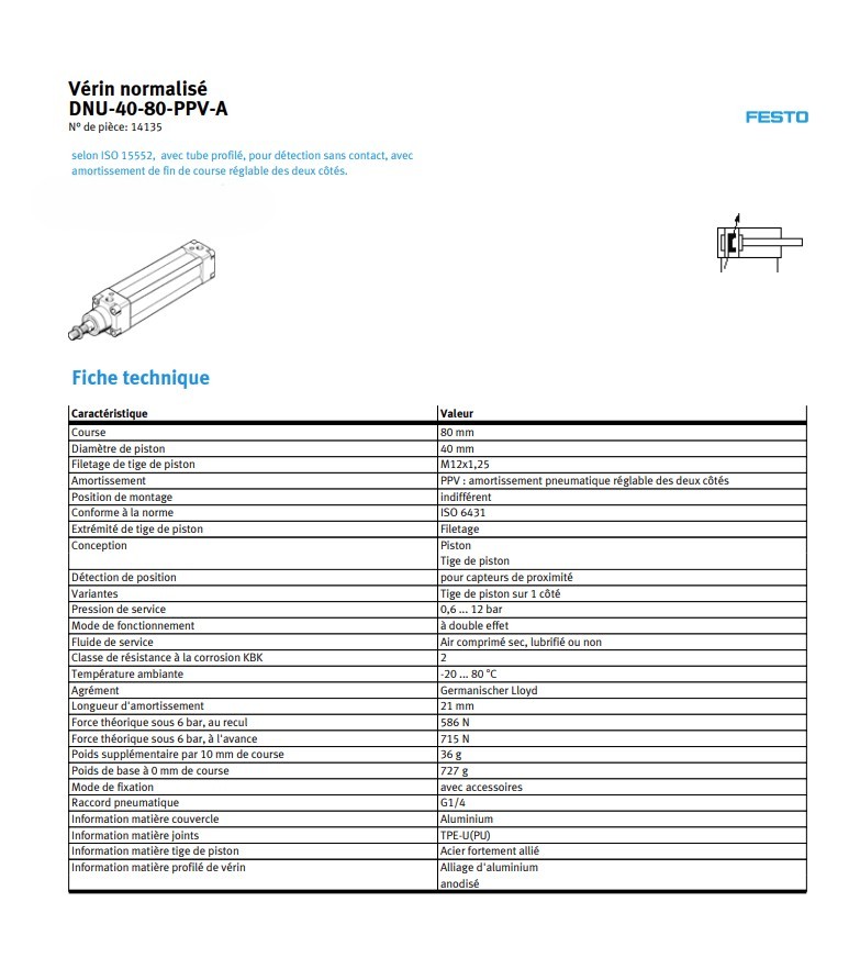 Le vérin FESTO DNU‑40‑80‑PPV‑A est un composant pneumatique industriel double effet, conçu pour offrir un mouvement linéaire précis et fiable.